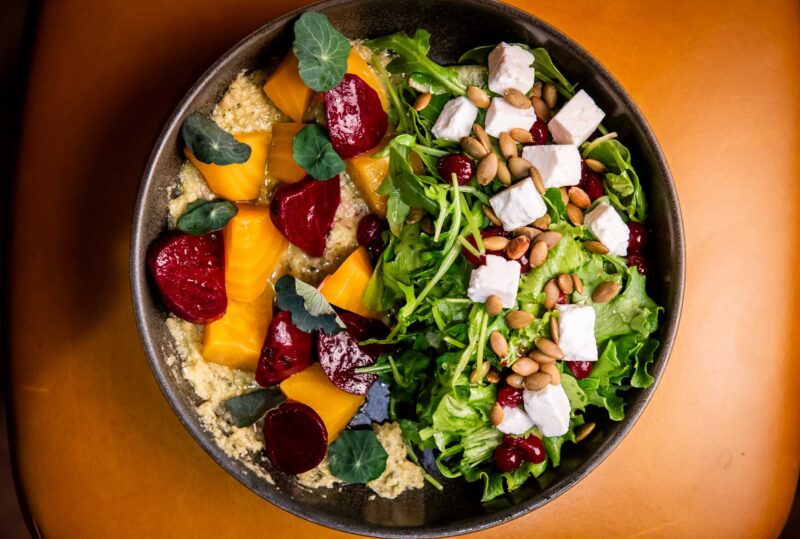 roasted & pickled beets, arugula, fava pesto, feta, pickled cranberries, pepitas, mustard vinaigrette