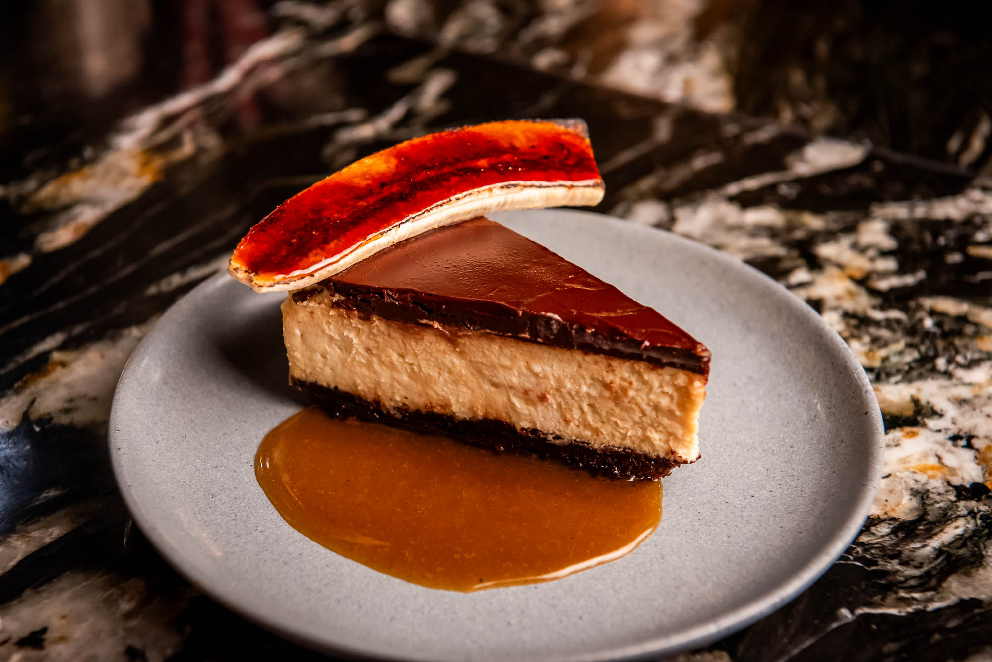 chocolate crumble crust, banana brûlée, chocolate & toffee sauces
