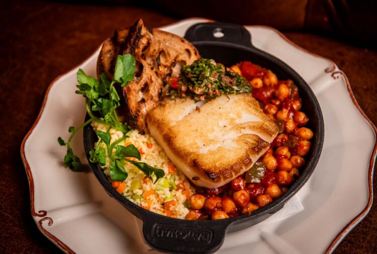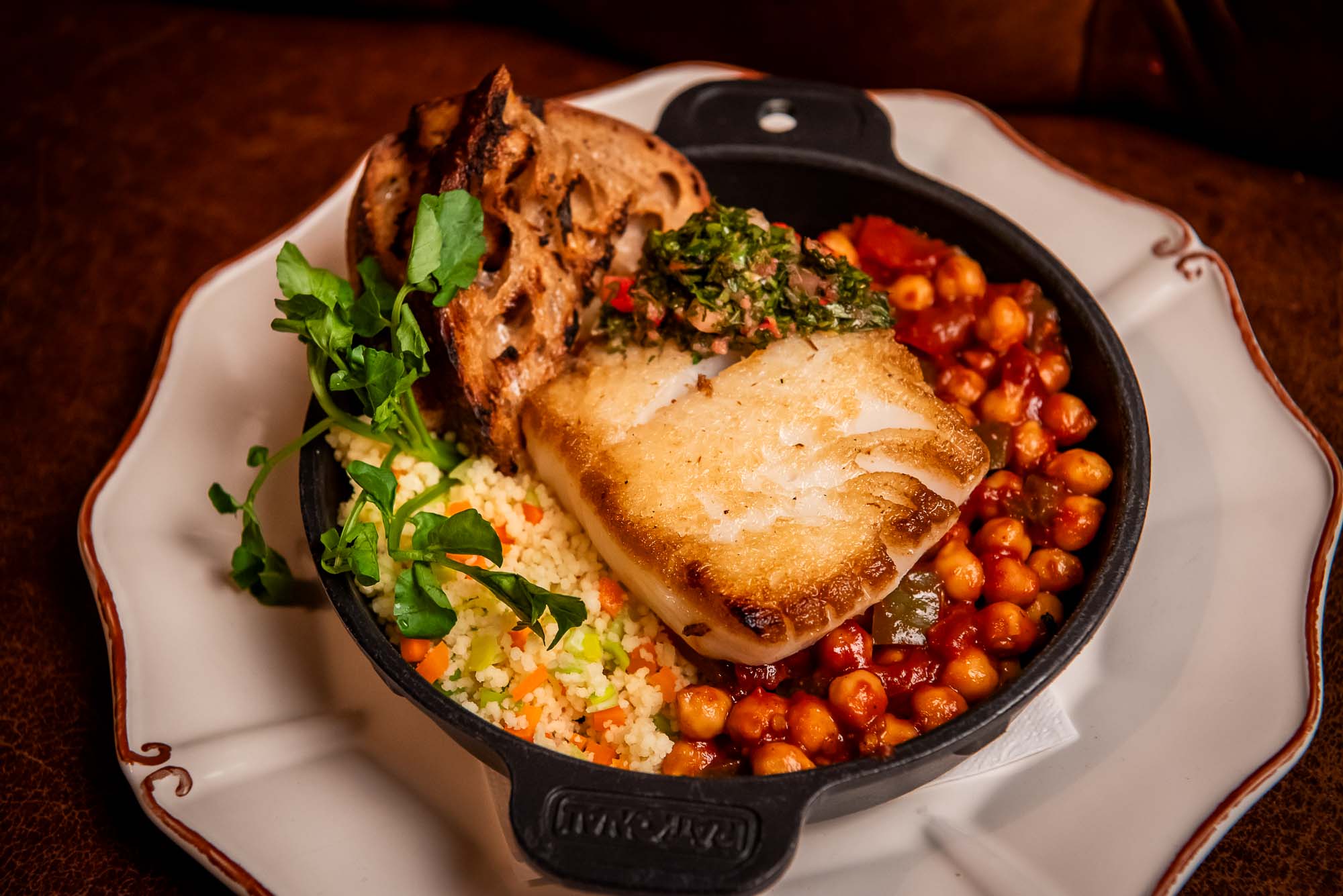 moroccan-style stewed chickpeas, couscous, courgettes, preserved lemon chermoula, roasted garlic crostini